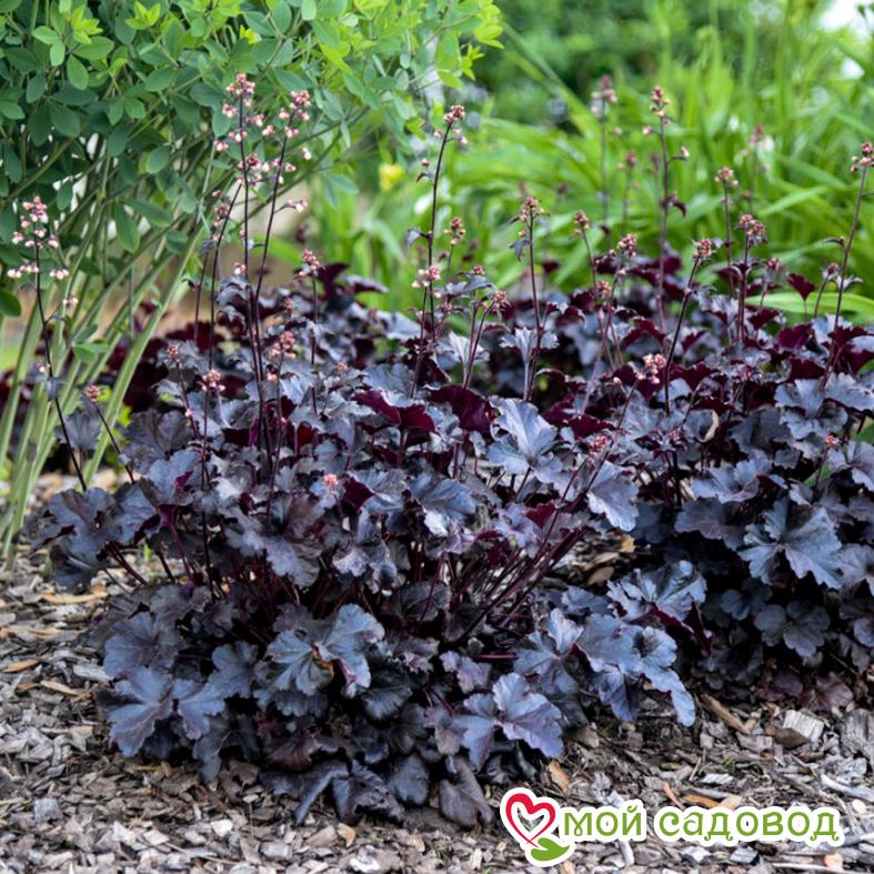 Гейхера Блэк Перл — вечнозеленое травянистое растение. Размеры одного кустика достигают 40 см в высоту и 50 см в ширину. Хорошо разрастается. Листья округлые, блестящие. Они не меняют окраску в течение сезона, оставаясь практически черными с розово-фиолетовой обратной стороной . Цветут с июня по август. В это время над кустом поднимается метелка с небольшими цветками розового цвета. Блэк Перл, как и все гейхеры, предпочитает легкие, умеренно-влажные почвы. Высаживать растение лучше в ажурной тени или полутени, но этот сорт отлично себя чувствует и на солнце. В целом абсолютно неприхотлив, устойчив к болезням, вредителям и морозам средней полосы России. На зиму не нужно срезать листья! Оздоровительная обрезка проводится весной. Гейхера – это целый род многолетних травянистых растений семейства камнеломковых. Эти растения в нашем климате уходят на зимовку под снег облиственными и с первыми лучами солнца снова украшают клумбу, создавая прекрасный фон для всех цветов, которые вырастут здесь позже.